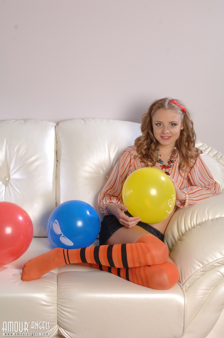 Beautiful shapely teen honey with colorful balloons taking off her clothes on the sofa