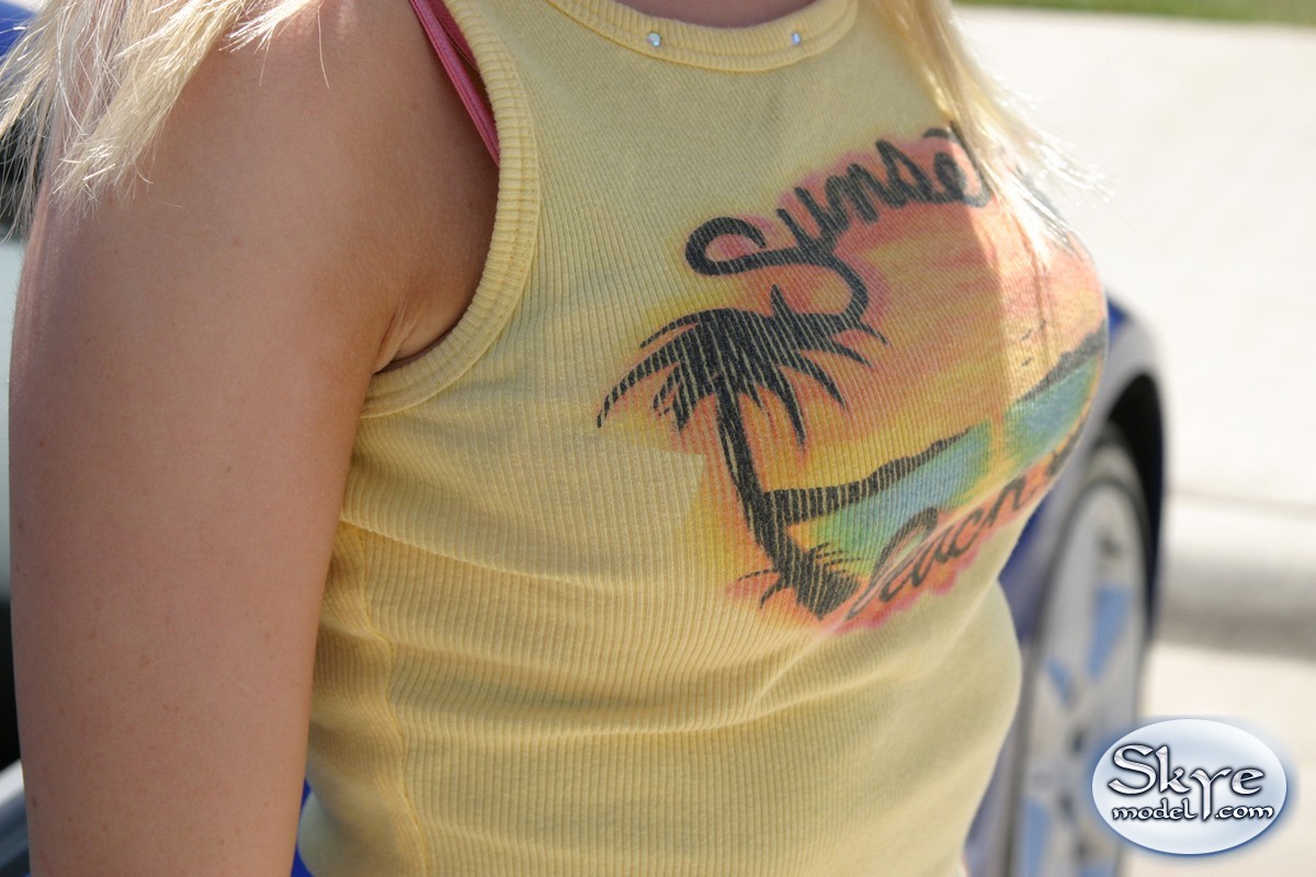 Blonde teen Skye Model shows off her tight teen body by her friends car